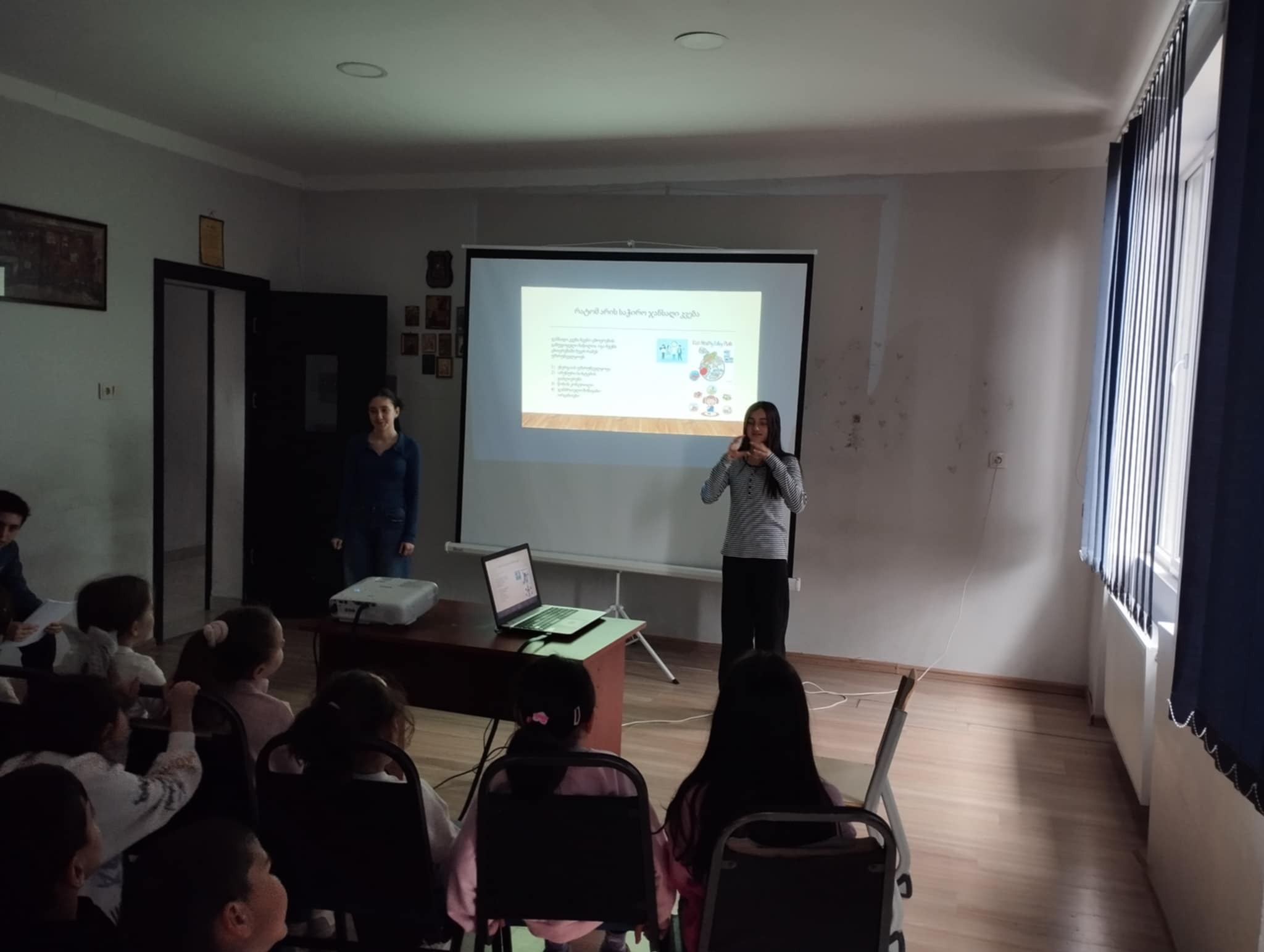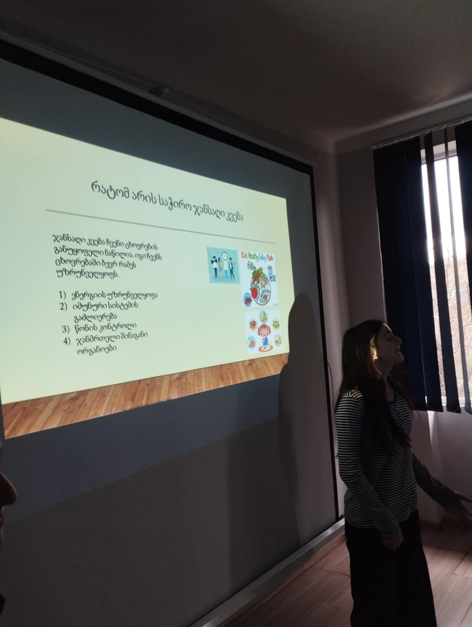 საქართველოს საპატრიარქოს წმინდა ნინოს სახელობის მართლმადიდებლურ სკოლაში VII ა კლასის მოსწავლეებმა: ანასტასია ფორჩხიძემ, ბარბარე ზიბზიბაძემ, დავით ბარბაქაძემ და გიორგი მეგენეიშვილმა, სამოქალაქო განათლების პედაგოგის, გრიგოლ ბენდელიანის უშუალო მენტორობით, პირველკლასელებისთვის საინტერესო და შემეცნებითი პრეზენტაცია ჩაატარეს, რომელიც ჯანსაღ ცხოვრებასა და სწორი კვების პრინციპებს შეეხებოდა.